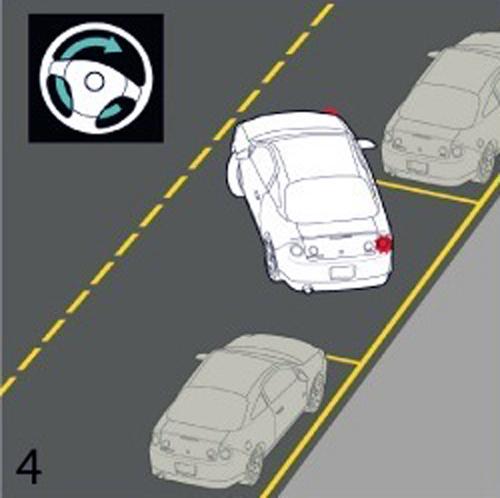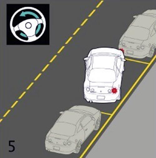 5 – Quando estiver nesta posição, indicada na imagem, vire novamente o volante, mas desta vez para o lado contrário em que esteve a virar, de forma que ele fique reto novamente.